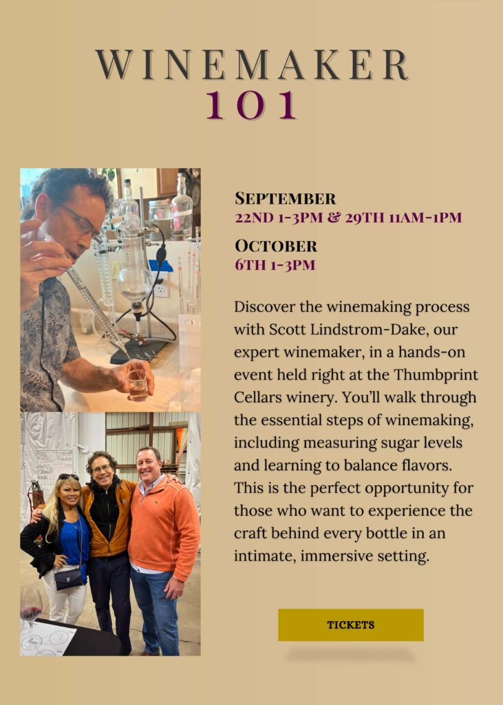 Discover the winemaking process with Scott Lindstrom-Dake, our expert winemaker, in a hands-on event held right at the Thumbprint Cellars winery. You’ll walk through the essential steps of winemaking, including measuring sugar levels and learning to balance flavors.