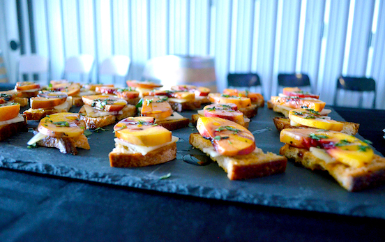 Slice the peach, smear about a ½ of a tablespoon (more or less depending on preference) of the fresh ricotta, drizzle a bit of the Meyer Lemon Olive Oil, a tiny pinch of sea salt and top with the fresh basil.